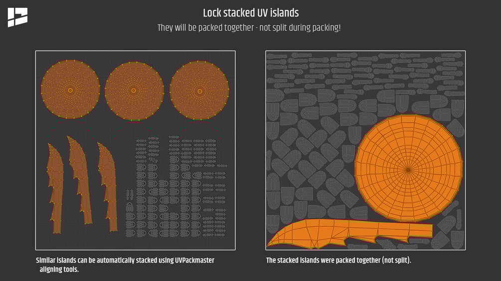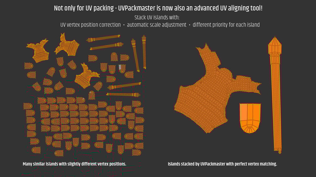 UVPackmaster 3 is a milestone that moves the tool towards more general UV applications. UVPackmaster is now not only a state-of-the-art UV packing solution – it also introduces an advanced UV aligning/stacking algorithm and other auxiliary tools, greatly simplifying your UV workflow.