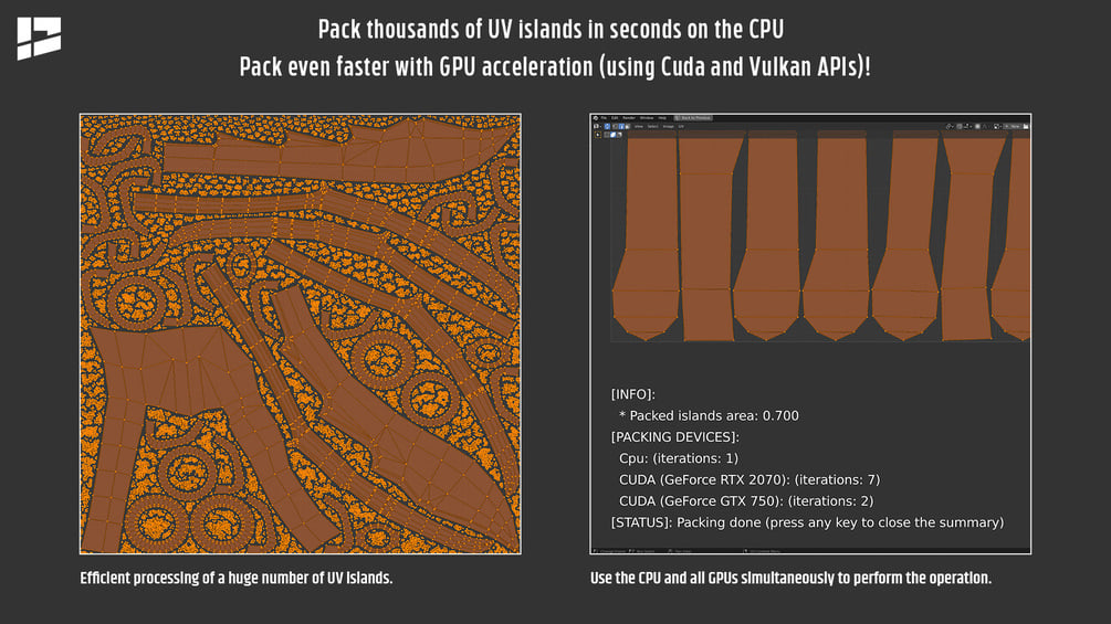 UVPackmaster is the most efficient UV packer out there in terms of packing on CPU, but it also provides a GPU-accelerated variant of the algorithm (using Cuda and Vulkan APIs). When running on a GPU, it significantly outperforms all other packers available.